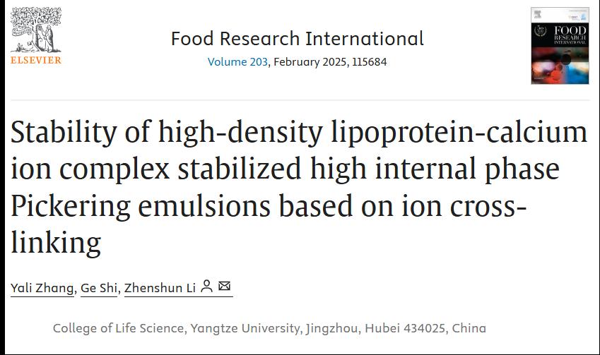 李真顺教授课题组在食品领域Top期刊《Food Research International》(IF=7.0,中科院一区)上发表了题为“Stability of high-density lipoprotein-calcium ion complex stabilized high internal phase Pickering emulsions based on ion cross-linking”的学术论文。硕士生导师李真顺教授为论文通讯作者,论文第一作者为食品加工与安全专业2019级硕士研究生张亚丽、第二作者为食品科学与工程专业2023级硕士研究生史歌,麻豆a片