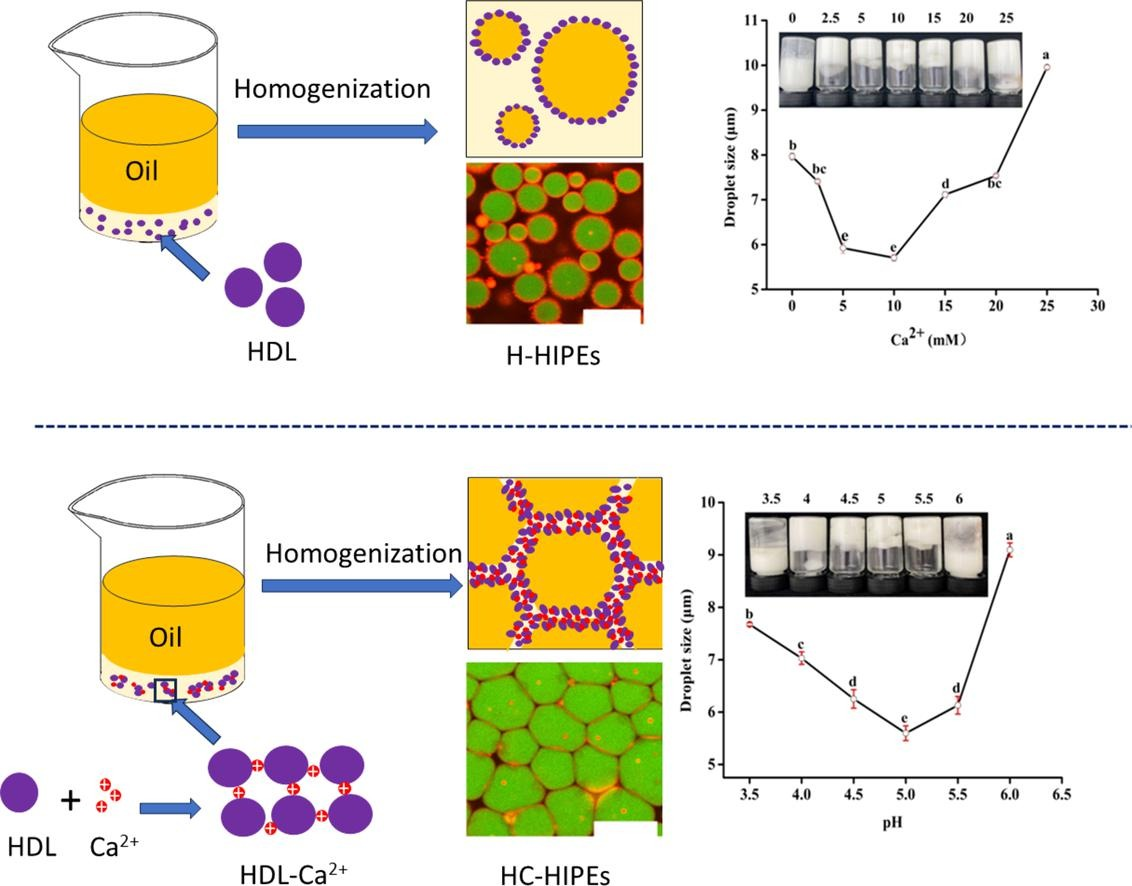 以不同的pH条件和Ca2+浓度作为环境调控因素,考查Ca2+与HDL形成HDL-Ca2+复合物的界面乳化特性。结果表明,Ca2+通过离子链连接HDL颗粒的阴离子基团,形成较厚的HDL-Ca2+界面层,增加了HDL的油水界面活性,抑制了液滴的运动和聚集合并,增加了HIPEs的稳定性。在Ca2+浓度为10 mM,pH值为5的条件下可获得稳定的HIPEs。该研究揭示了基于离子-蛋白质界面交联稳定HIPEs的机制,为提高蛋白基HIPEs的稳定性提供了新的思路。