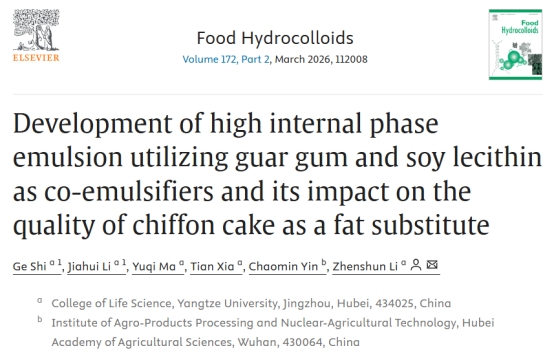 食品高分子团队在食品领域Top期刊《Food Hydrocolloids》(IF=12.4,中科院一区)上发表了题为“Development of high internal phase emulsion utilizing guar gum and soy lecithin as co-emulsifiers and its impact on the quality of chiffon cake as a fat substitute”的学术论文。团队负责人李真顺教授为论文通讯作者,论文第一作者为食品科学与工程专业2023级硕士研究生史歌,麻豆a片