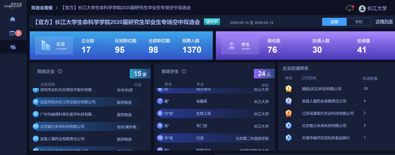 认真筛选审核通过的有17家,共提供岗位数95个,招聘人数达1370人,双选会当日在线企业15家。共涉及单位包括来自北京、广东、上海、浙江、武汉、宜昌、荆门、荆州等多个地区,提供包含研发工程师、生产技术员、检验员、辅导老师、销售等多种岗位。其中,参与本科生专场双选会的学生共报名102人,投递简历51人,投递简历量100份,其中本校学生报名人数48人,投递简历量69份,当日到场学生43人。参与研究生专场双选会的学生共报名76人,投递简历30人,投递简历量41份,其中本校学生报名人数22人,投递简历量16份,当日到场学生10人。