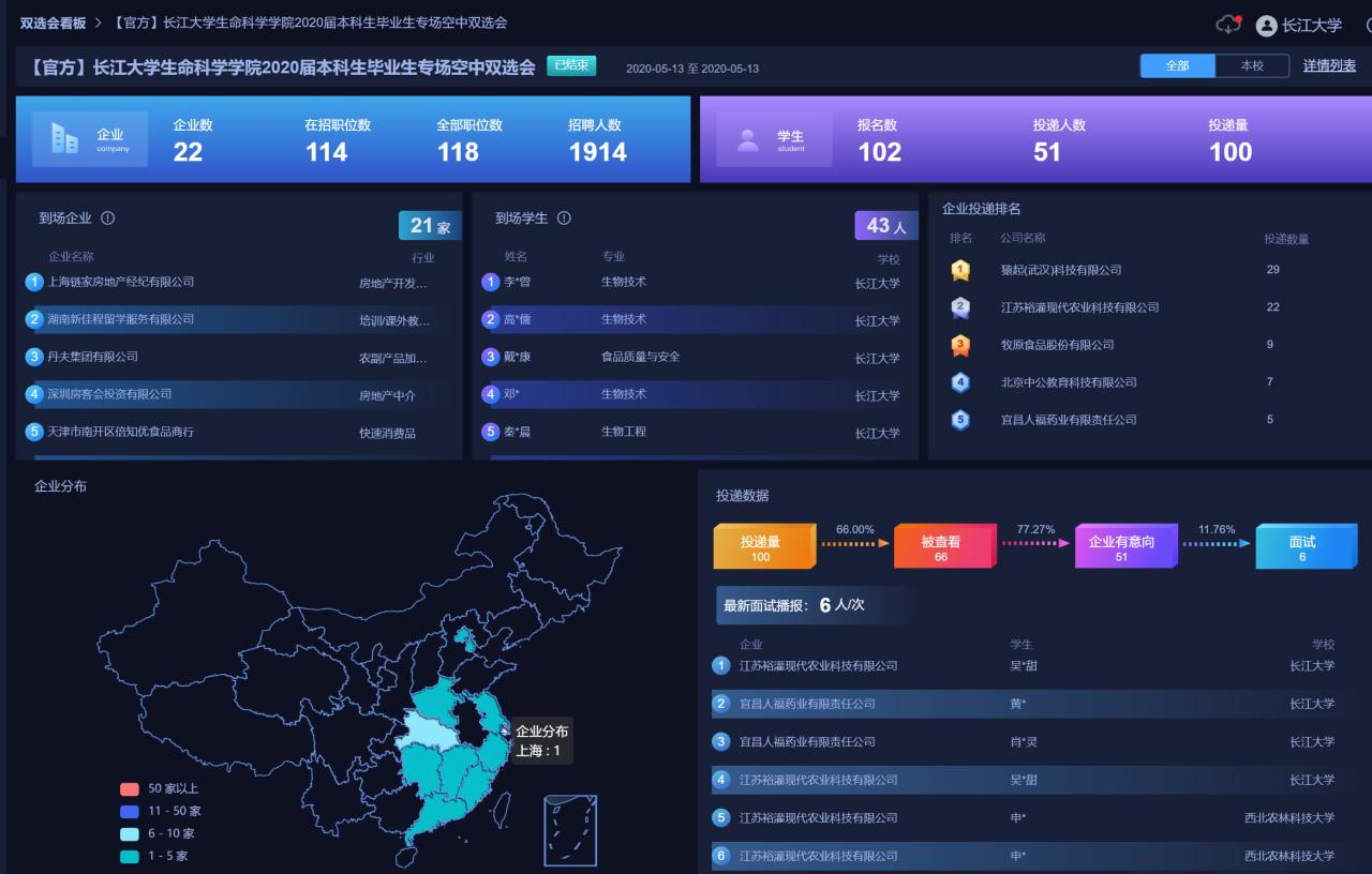 开展的第一次毕业生空中双选会不同的是,此次双选会是分本科和研究生两个不同学历层次分别开展。学生和用人单位整个过程都是通过线上交流,4月22日至双选会正式开始前一天都属于前期准备阶段,学生通过学生报名链接进行报名并投递简历,用人单位通过企业报名链接进行报名并发布职位,期间可以查看学生投递简历情况。5月13日和5月14日9时至18时则是正式面试阶段,用人单位与学生通过该平台进行线上文字交流或视频面试。