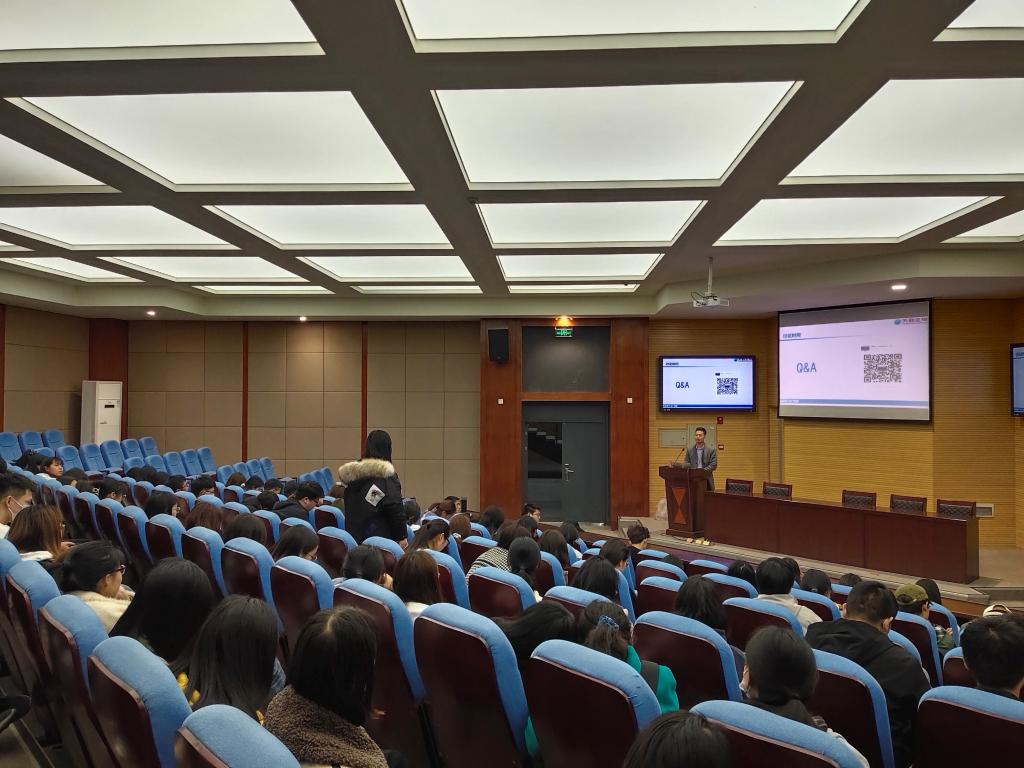 库兵老师是国家一级人力资源管理师,国家二级企业培训师。有着非常丰富的人力资源管理工作经验,具备超高的职业素养。本次讲座库兵老师首先讲述了大学生进入企业需要从意识、心态及行为进行角色的转换。其次是大学生职业发展通道,了解企业的业务结合自己的长处做出正确规划。接下来讲述了大学生应如何初步制定职业发展规划,并且对自己所在企业科研做出介绍。最后,库兵老师对面试技巧提出“三结合”方法,以及面试时可能出现的问题进行剖析。同学们全程也都非常认真的聆听和学习,不少同学与库兵老师进行了互动。