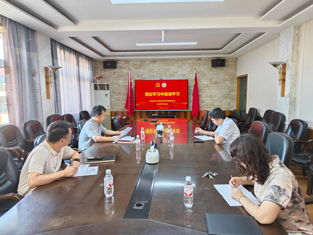 党委理论学习中心组在西校区行政楼323会议室开展七月份政治理论集中学习,中心组成员参加,会议由党委书记谢作喜主持。