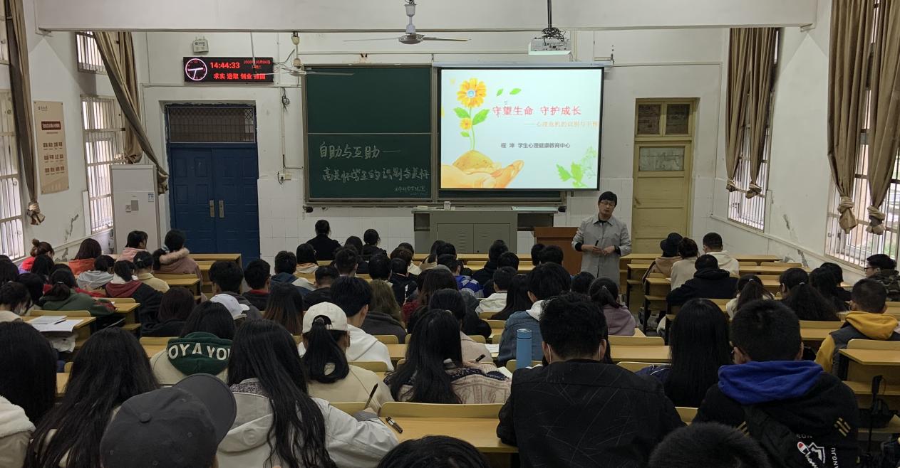 心理健康教育体系、高关怀学生的类型和表现、心理危机的识别与干预、学生骨干的责任和义务四个方面展开讲解。程老师结合教学经验和自身经历,为同学们深入分析了心理危机存在的必然性和可控性。他提到,“心理危机是可以被早期识别和干预的,人与人之间必然存在着包括亲情、友情、爱情在内的多种‘纽带关系’,当自身或者身边的人出现心理危机特征时,我们可以巧妙利用这些‘纽带’,一定程度上的化解危机,提前干预。”他还强调道,作为学生骨干应深入到学生群体中,主动关心、留意身边同学的行为表现,出现疑似异常状态时主动向老师汇报,及时提供帮助,协力共同营造良好的大学生心理健康氛围。