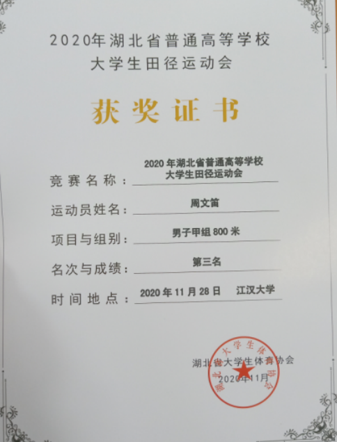 (通讯员 范昆琨)11月28日至29日,由省教育厅主办,湖北省大学生体育协会、江汉大学承办的2020年湖北省大学生田径运动会在江汉大学举行。在两天的比赛中,麻豆a片 代表生科类32005班周文笛奋力拼搏,取得了甲组男子800米第三、400米第四的骄人成绩。