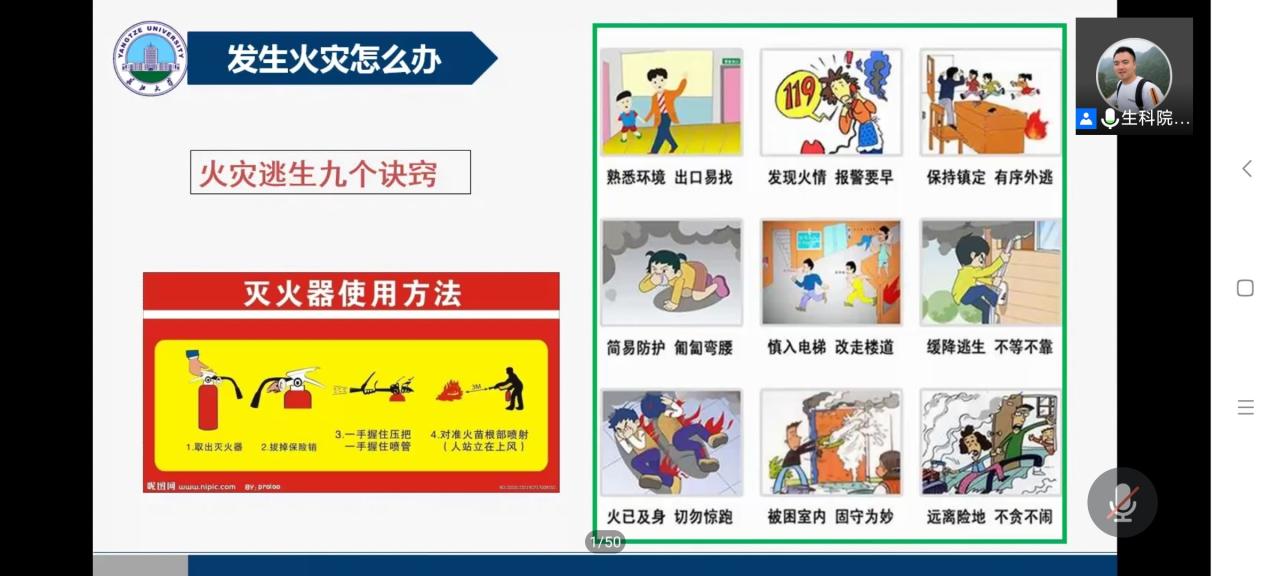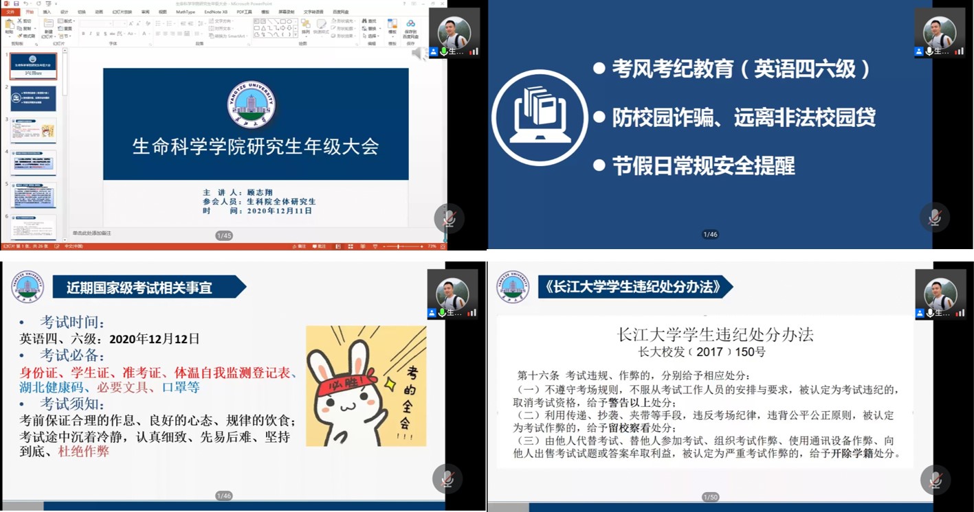 顾老师也对全体研究生进行了节假日常安全提醒,包括对火灾的防控,疫情期间要戴好口罩不要到人群聚集处,节假出行要注意交通安全以及加强对艾滋病的预防。最后,老师还劝解各位不要饮酒,并用现实的例子展现了其危害性。