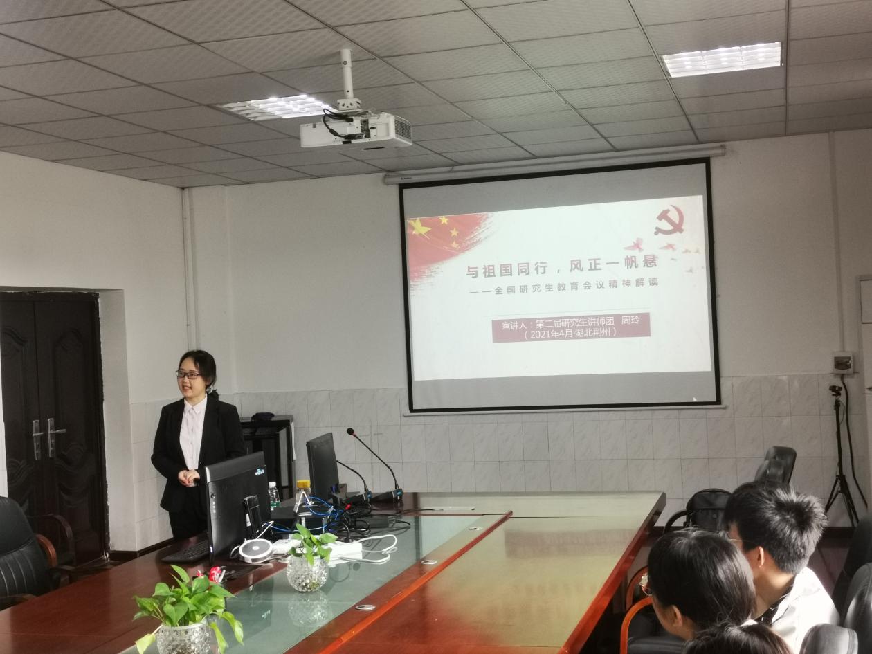 周玲分别从研究生教育发展史、时代的号角、与祖国同行三个方面进行宣讲。让同学们深知我们成长的新时代,是近代以来中华民族发展的最好时代,也是实现中华民族伟大复兴的最关键时期。周玲在此向同学们传达了习近平总书记就研究生教育工作作出重要指示:中国特色社会主义进入新时代,即将在决胜全面建成小康社会、决战脱贫攻坚的基础上迈向建设社会主义现代化国家新征程,党和国家事业发展迫切需要培养造就大批德才兼备的高层次人才。