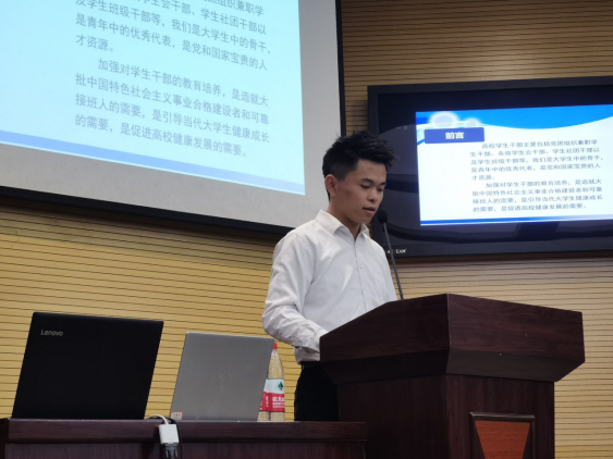 分团委副书记刘盛茂进行讲解,主要内容有学生干部的重要作用、思想状态、存在的问题、应有的素质原则、如何推进工作完成以及若干关系处理等方面,在本次培训中,各位学生干部都学有所获,对自身工作的优势与不足有了更深刻的认识,更加坚定了学生干部的信念立场。