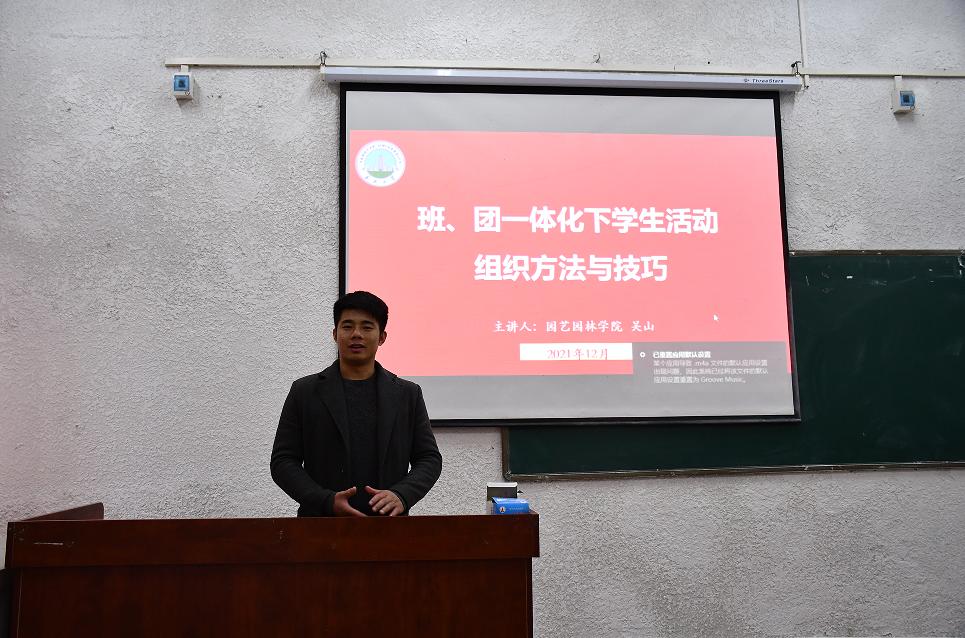 园艺园林学院辅导员吴山以《班团一体化下学生活动组织方法与技巧》为主题深入解读了高校共青团改革实施方案,围绕全团“凝聚青年、服务大局、当好桥梁、从严治团”四维工作格局,深入实施高校基层团支部“活力提升”工程,积极推进“班级团支部与班委会一体化运行”工作,突出以班级团支部为核心的班集体建设。同时,结合麻豆a片