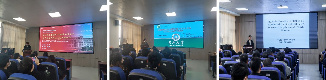 食品科学与工程专业的硕士研究生徐涛向大家分享了《基于纳米脂质——马铃薯淀粉复合体系稳定的Pickering乳液研究》的汇报;风景园林专业的硕士研究生刘瑞成进行了《球囊霉素相关土壤蛋白通过调节生长素对枳生长发育产生的影响》的汇报;遗传育种专业的博士研究生蒋伟就其《植物14-3-3蛋白的分子进化和大麦14-3-3A调控气孔响应干旱的分子机制》的研究进行了汇报。