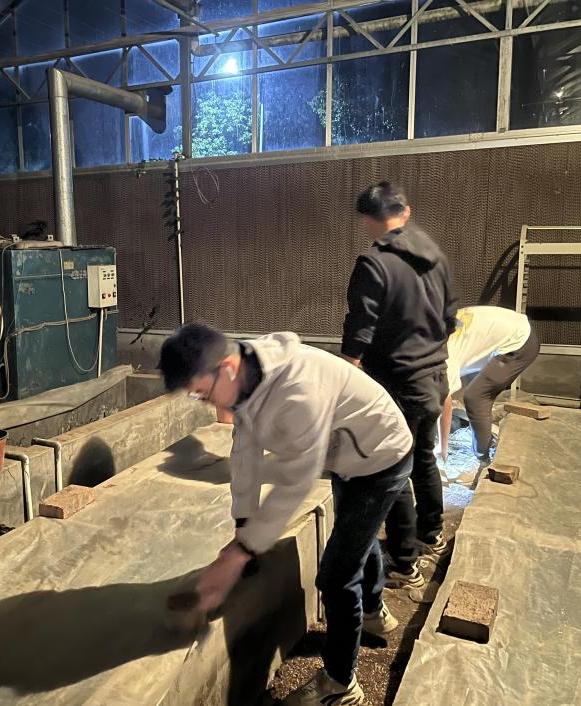 (图为课题组学生夜晚在温室为实验材料盖膜保暖)