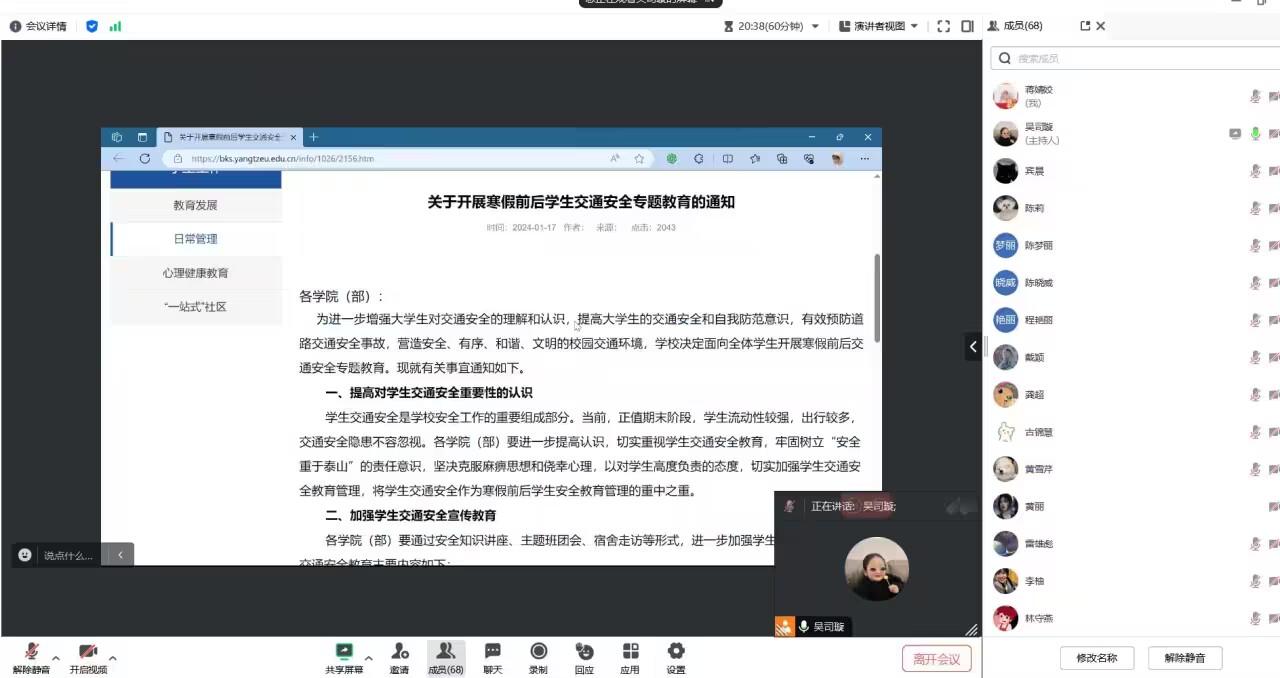 组织研究生各班级在线开展“返校安全教育班会”,重点讲解学生返校须知及注意事项,开展返校安全教育活动。