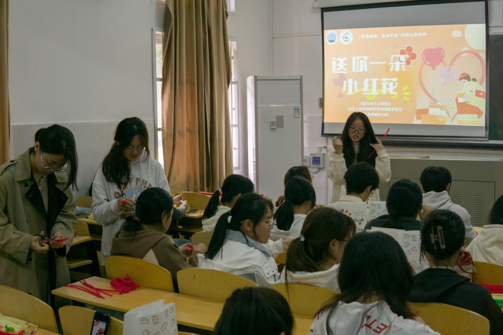 在活动的最后,大家纷纷捐赠出自己制作的小红花,这些小红花也会在后续即将举行的义捐义卖活动中作为赠品在同学之间传递。
