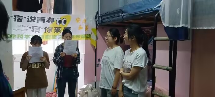 宿舍成员先后介绍宿舍内部建设、展示寝室安全细节和文化建设特色;学生通过分享“宿舍小故事”,“宿”说属于她们自己的青春美好瞬间。“我很喜欢这个宿舍和宿舍的姐妹,我们会一起过生日,一起分享属于我们自己的小温馨”河滨公寓2栋307室郭赛雅同学跟大家分享道。
