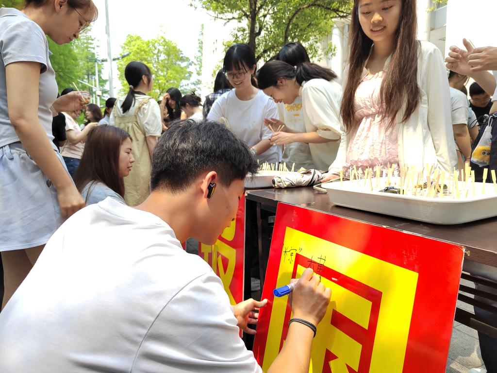 移步至品鉴区,“粽”横四海队的蜜枣粽、“粽”享丝滑队的肉松粽、“粽”里寻她队的蛋黄粽......俨然踏入《楚辞》中的美食图鉴。师生们赶集式地挨个摊位参观,用竹签取样品尝,就外观、口感、食材搭配等交流讨论,频频点头,并给自己中意的队伍打分。“这个方形的粽子做的好有特色,蜜枣馅口感也很好。”“粽”横四海队的摊位前人头攒动,赞不绝口。