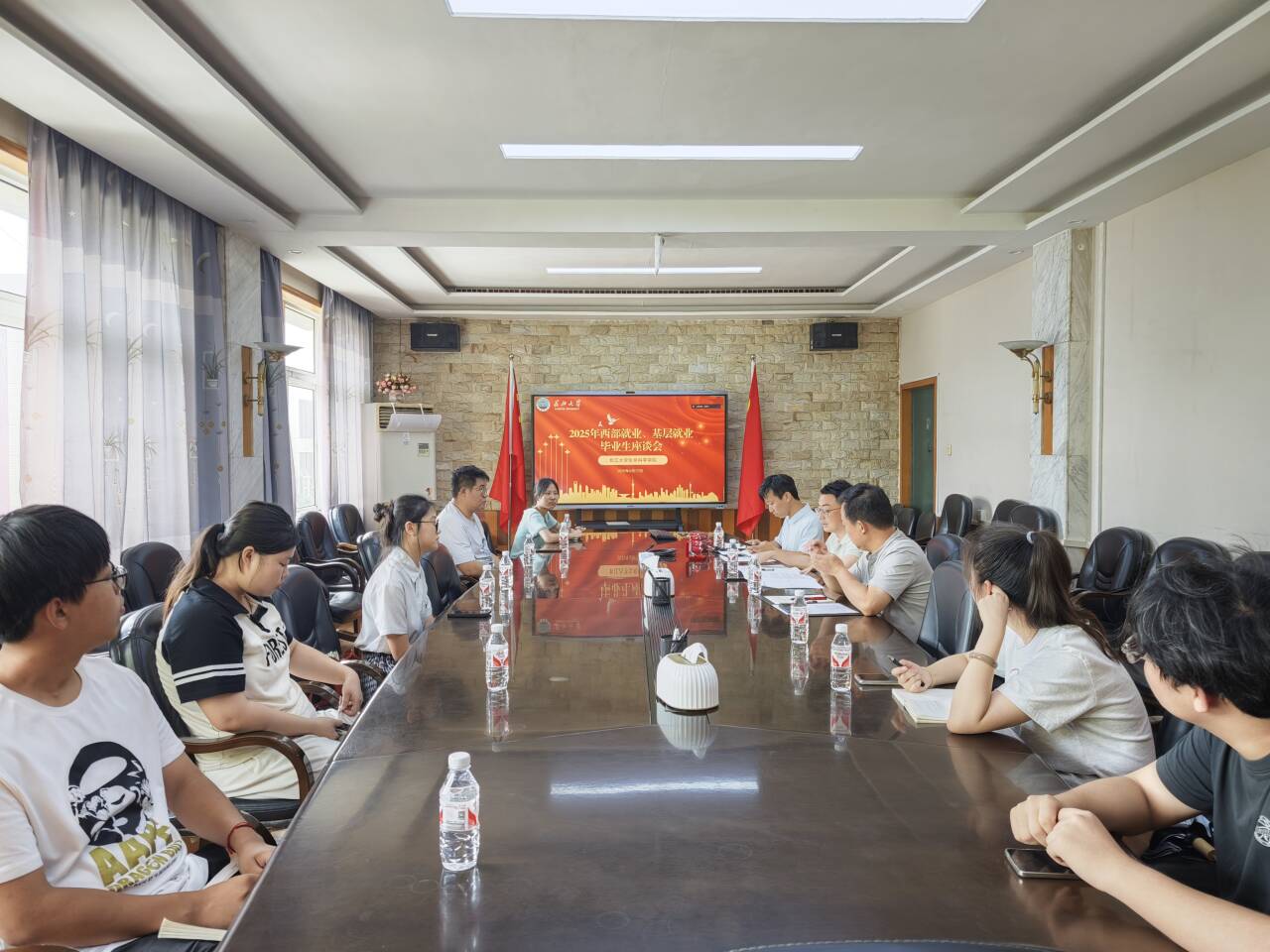 于6月17日在行政楼323会议室举办2025届西部就业、基层就业毕业生座谈会。学院党委书记谢作喜、副书记万波与已签约赴西部和基层就业的毕业生代表及意向学生共话基层发展。