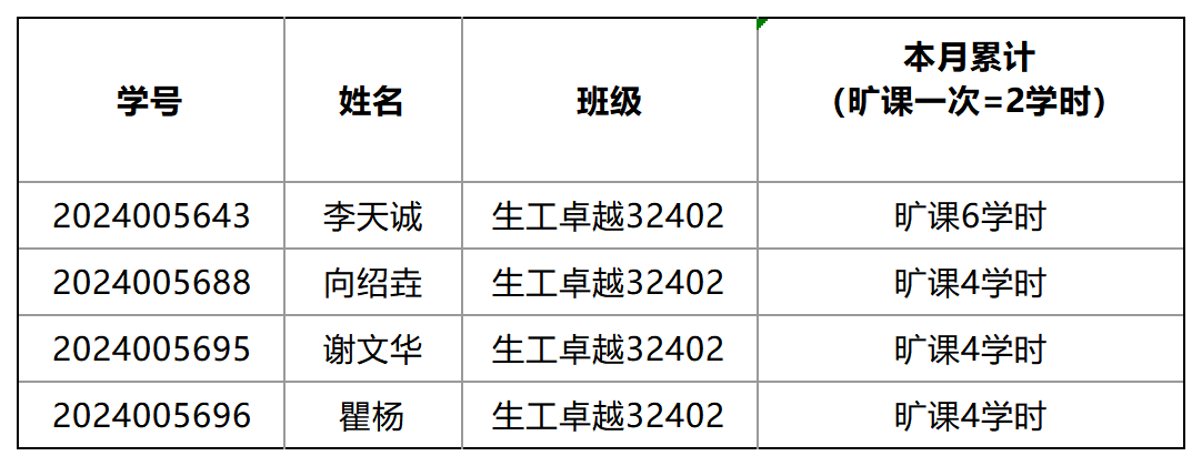课堂考勤实施办法》,经学工办研究决定,对本月累计旷课4学时及以上的同学予以通报批评: