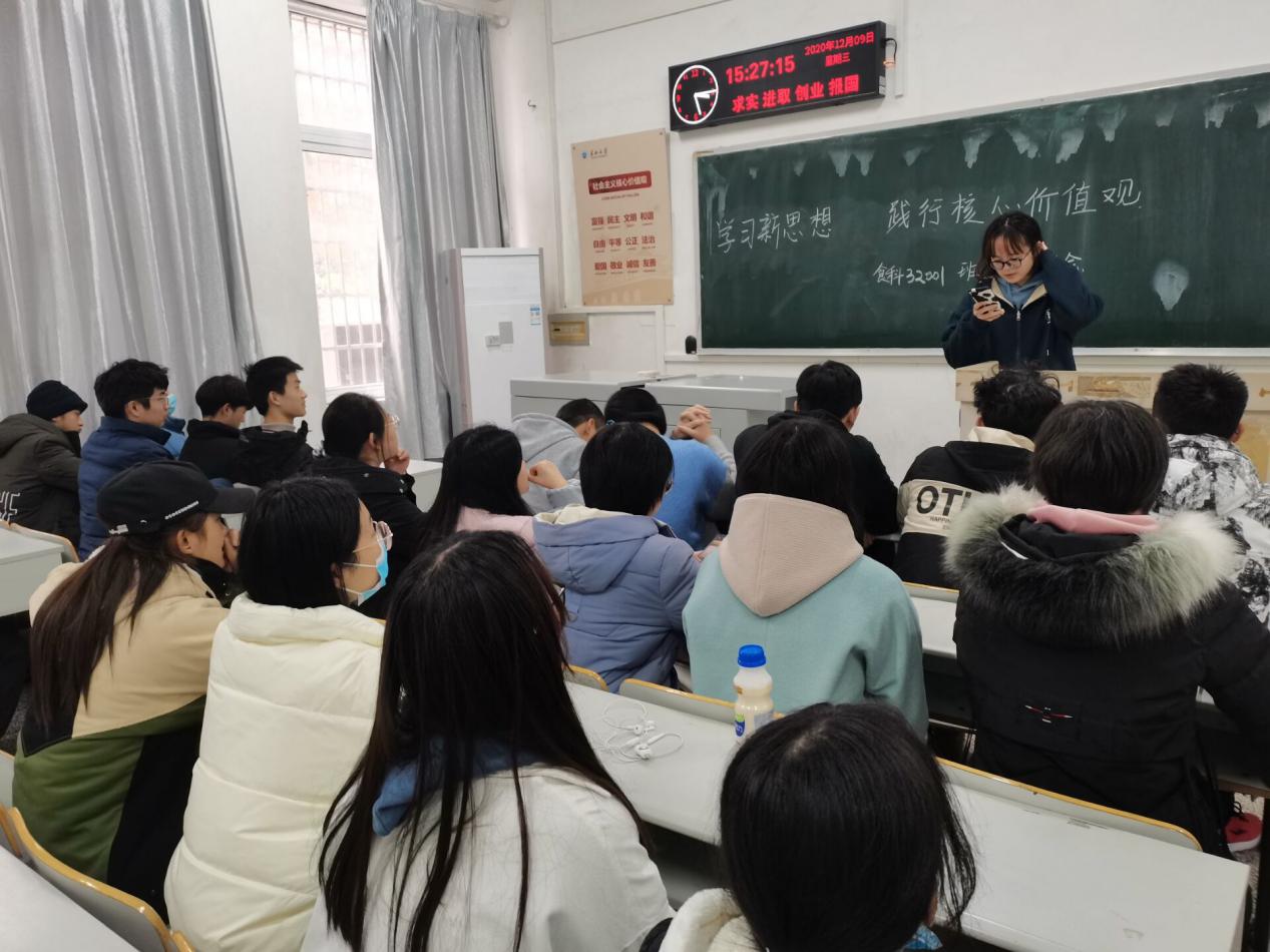 (通讯员 周永琪)为提升支部活力,引导支部学习新思想、把握新动态,切实提升团员青年的政治思想素质,增强基层团组织的凝聚力和战斗力,12月9日15:00,食科32001班于7教105召开了“学习新思想 践行核心价值观”的主题团会。食科32001班全体同学参加会议。