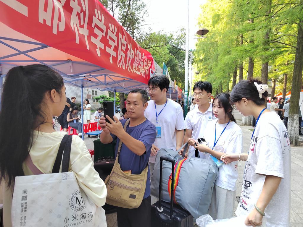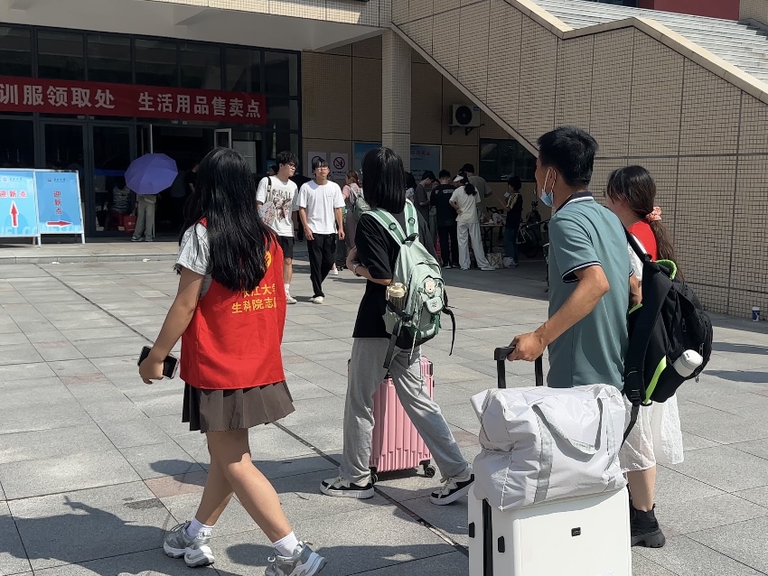报到现场人流如织却井然有序。一张张笑脸,一句句问候,欢迎着每一位加入生科院的学子。迎新志愿者在摊位指引新生完成报到手续,分发物资,随后引导他们进入新宿舍。暑气未消,阳光热辣,身穿红衣的志愿者们兢兢业业,迎新的路上充斥着大家的欢声笑语。志愿者们热心地帮新生和家长解答困惑,一路的热情也帮助他们消除了初来乍到的陌生感。