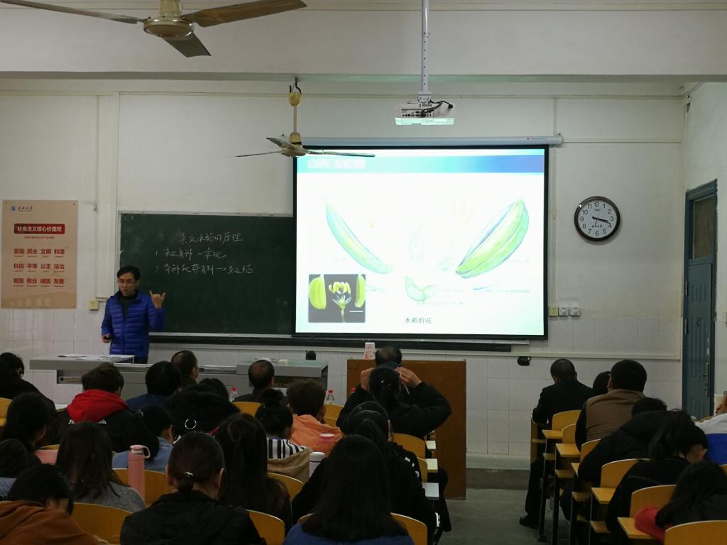 “仓廪实而知礼节,衣食足而知荣辱。”罗岸老师带领同学们追溯水稻的万年发展史;“现代高产杂交水稻离不开每一位致力于此的科学家”他列举袁隆平院士、丁颖先生等著名水稻科学家的事例;“既然杂交水稻的一系、二系研究技术已经产生,那么会不会有一系法呢?”罗岸老师提出问题留下悬念引导学生主动探索。从野生稻的栽培再到杂种优势的提出,从杂交水稻的一系法再到二系法,罗岸老师声情并茂地向为同学们讲解“杂交水稻”的原理,抑扬顿挫的讲述、丰富的肢体语言,令现场掌声阵阵。