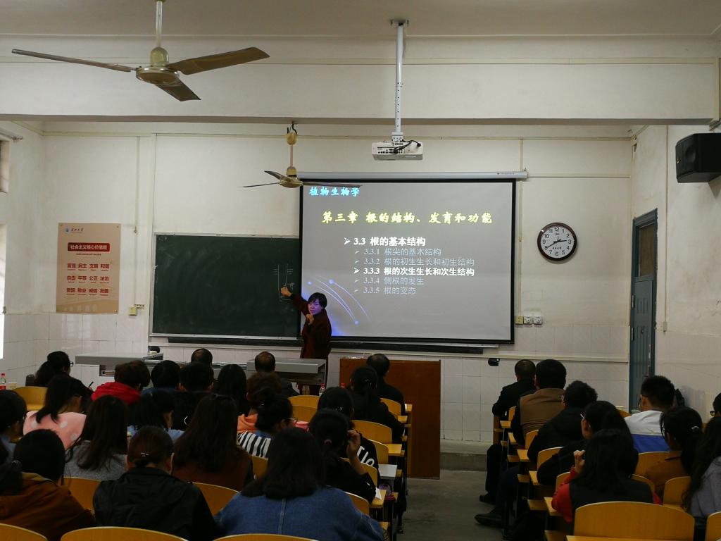 首先站上讲台的是陈卉老师,从回顾旧知识到引入新内容,陈卉老师以图为基础由内向外层层递进,讲解学植物生物学中的“根的结构、发育和功能”,课堂上她与同学们积极互动,运用模型作了生动演示,同学们听得津津有味。