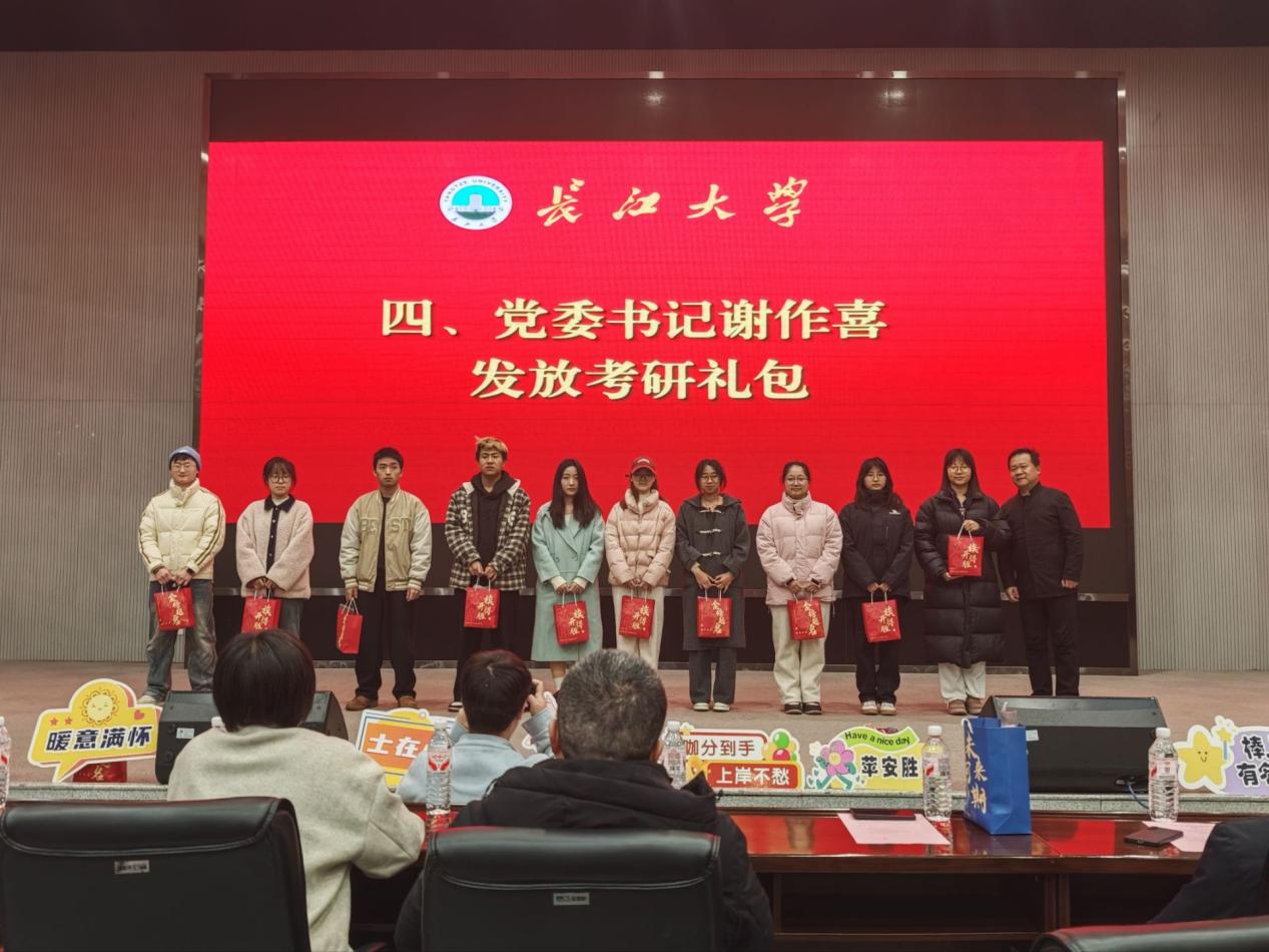 会议尾声,谢作喜书记带领老师们为学子发放慰问礼包,内含考试必备用品及暖心好物,传递学院期许。